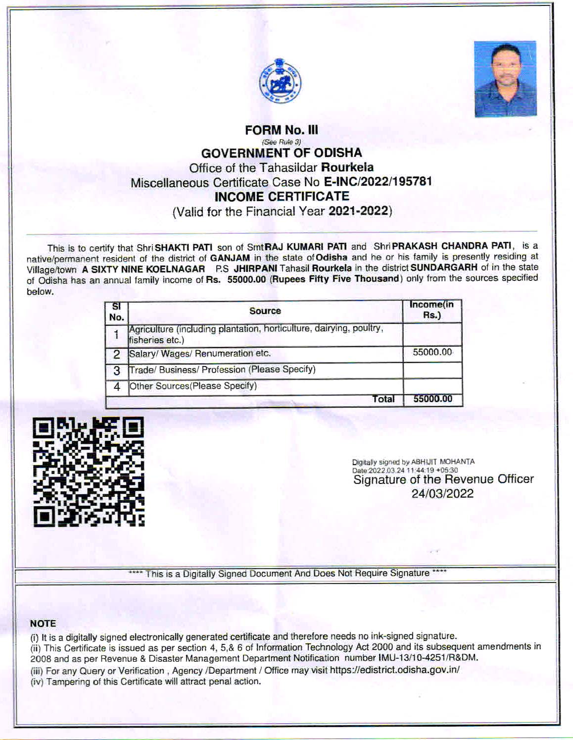 Family’s Annual Income: 55,000/-